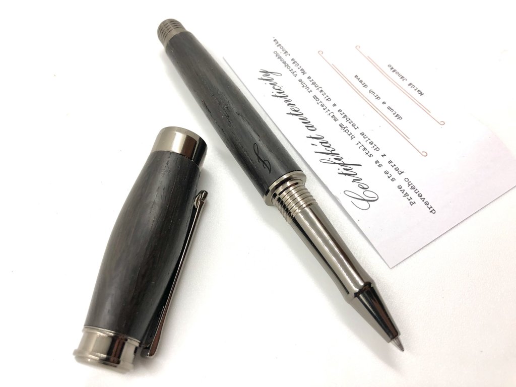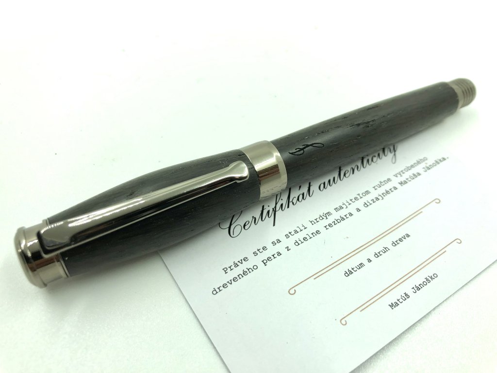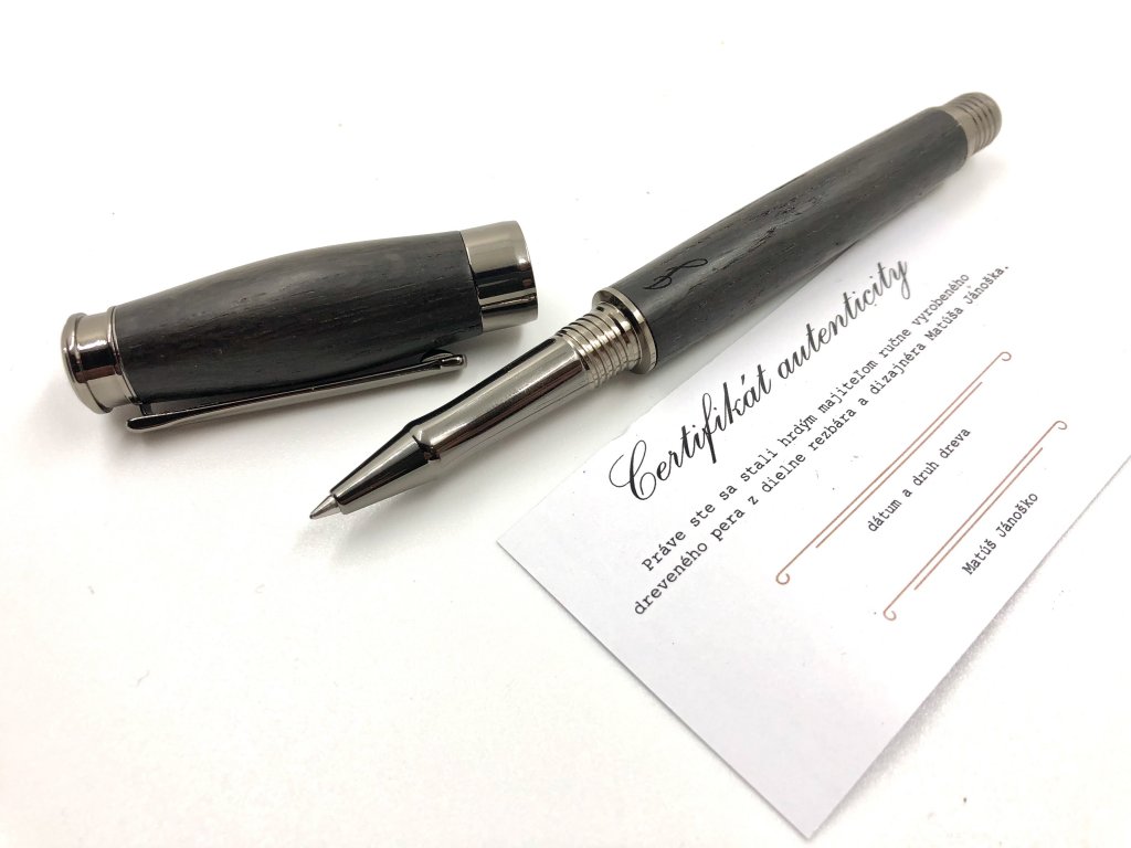 Guľôčkové pero s keramickou náplňou, oceľovým mechanizmom a dreveným telom.