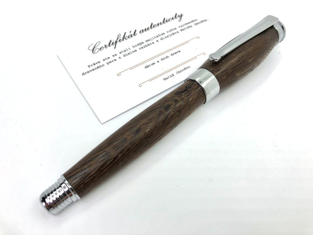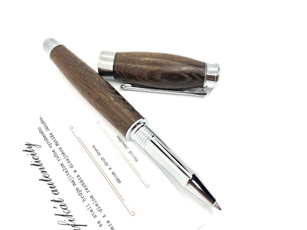 Guľôčkové pero s keramickou náplňou, oceľovým mechanizmom a dreveným telom.